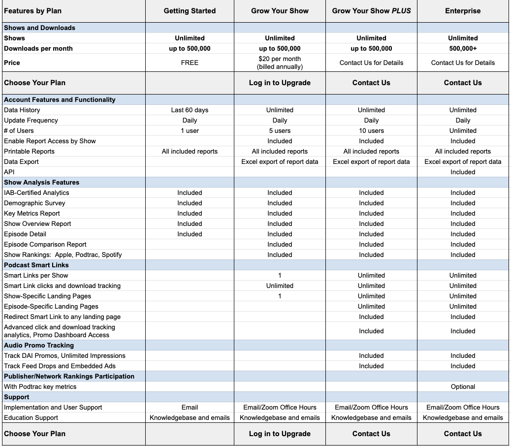 Grow Your Show Plus: If you want to promote your podcast(s) in other podcasts, or want to track effectiveness of multiple Smart Links posted to social media, newsletters or other websites - - or you're building a network of shows - - choose the Grow Your Show PLUS plan.