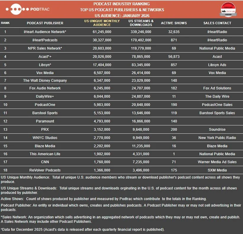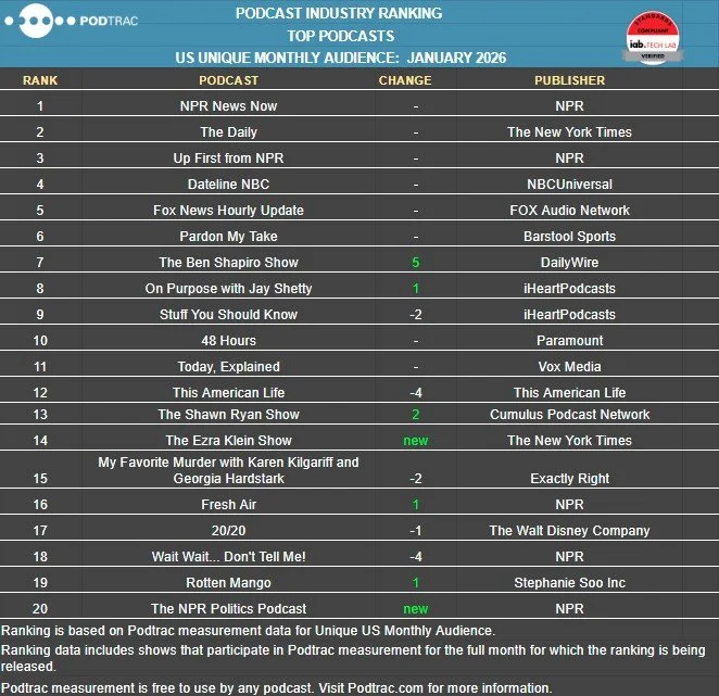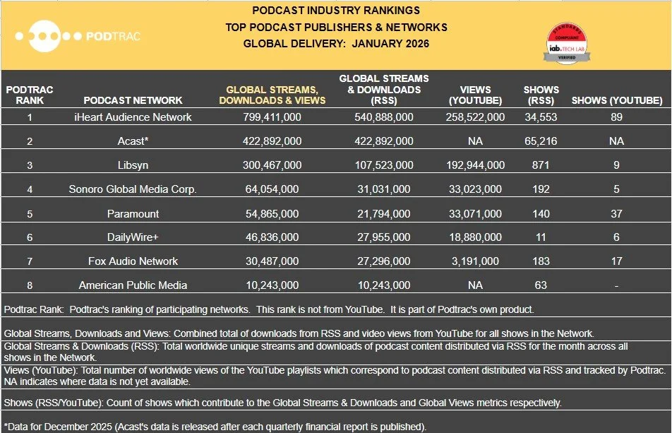 The Top US and Global Publishers & Networks and Top US Podcast rankings for January 2026 are now available at www.Podtrac.com.
